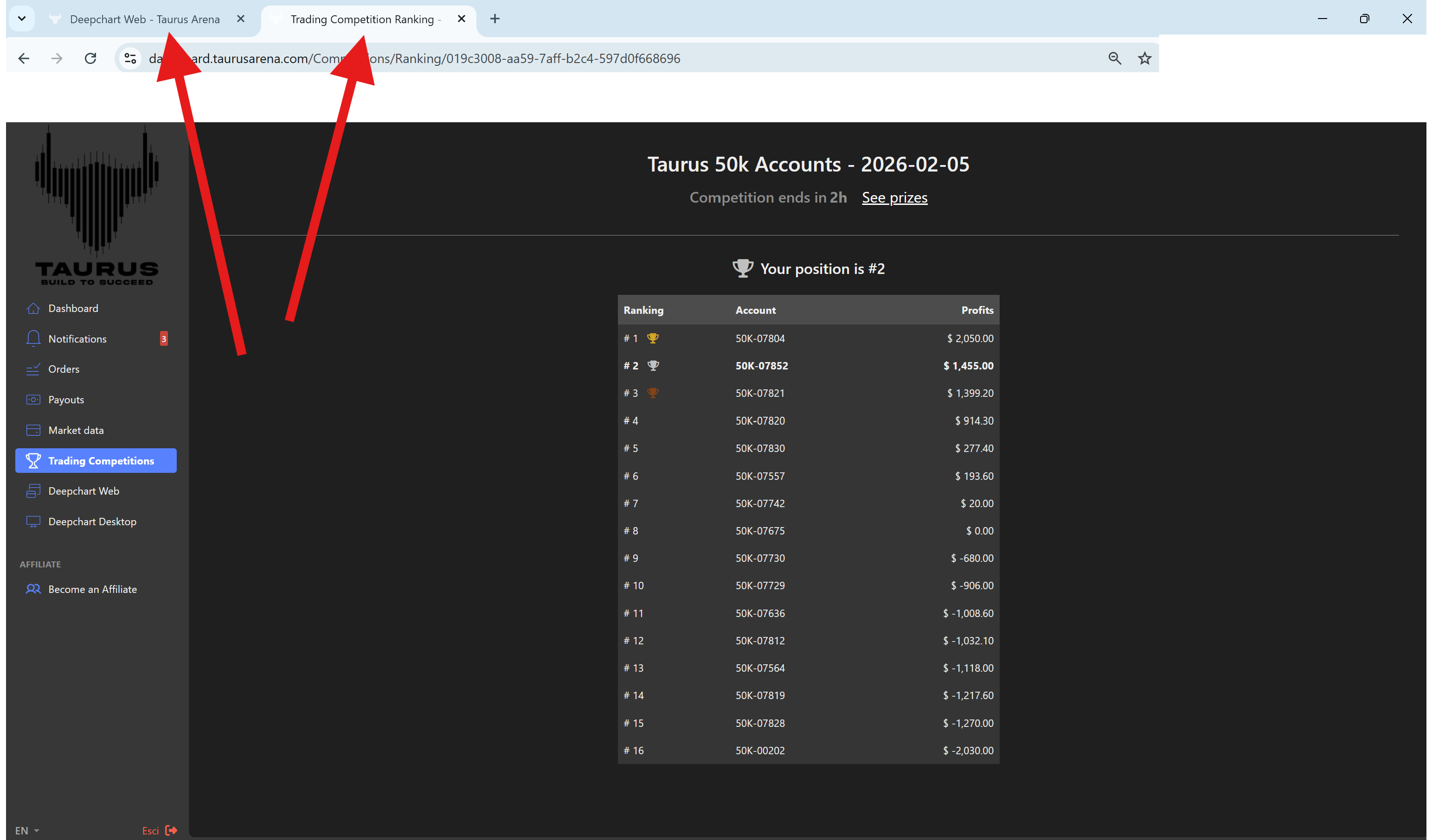 Pendant qu’ils tradent, les participants peuvent suivre le classement à tout moment depuis la section Trading Competitions en utilisant deux onglets du navigateur, sans avoir besoin de se déconnecter de DeepChart Web.