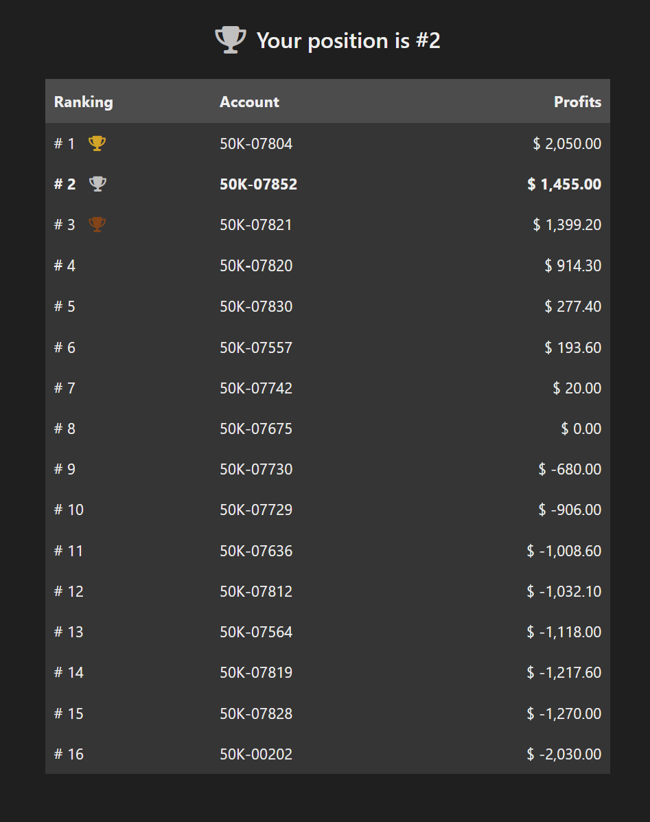 À partir de ce moment, chaque trade a une double valeur. Toute l’activité de trading continue de contribuer au PnL du compte et à sa progression habituelle, tout en comptant simultanément pour la position du trader dans le classement de la compétition. Cela permet aux traders de rester concentrés sur leurs objectifs habituels tout en concourant pour des récompenses supplémentaires, sans modifier leur stratégie, leur organisation ni leurs habitudes de trading.