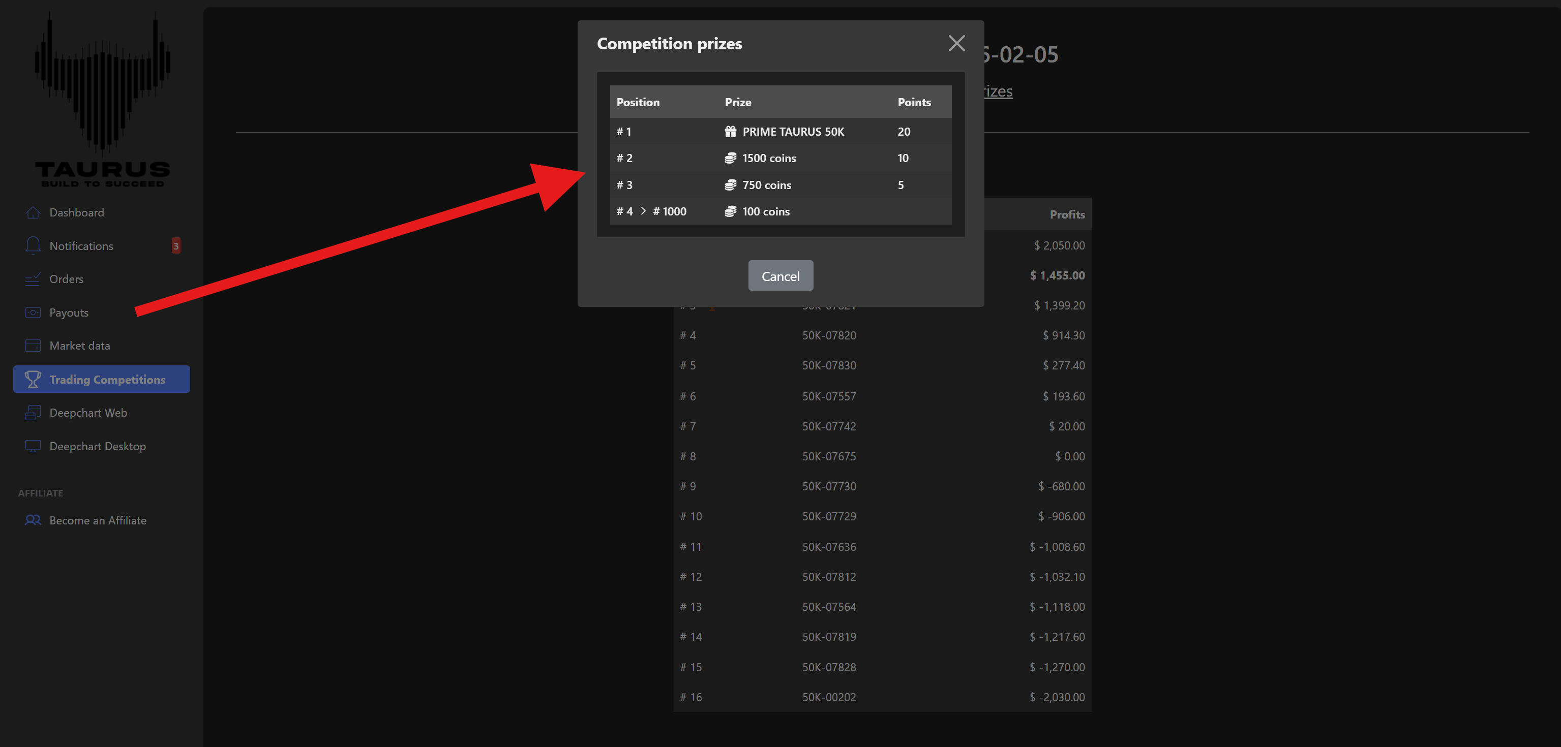 Une fois qu’une personne s’inscrit chez Taurus, elle obtient automatiquement l’accès au Dashboard. Lorsqu’un nouveau compte est acheté, le trader peut accéder directement à la plateforme de trading DeepChart Web ainsi qu’à la section Trading Competitions, le tout depuis un seul et même endroit, sans étapes supplémentaires ni coûts additionnels. Cela signifie que chaque trader disposant d’un nouveau compte a la possibilité de rejoindre des compétitions et de trader pour des récompenses, plutôt que de trader de manière isolée sans incitations supplémentaires.