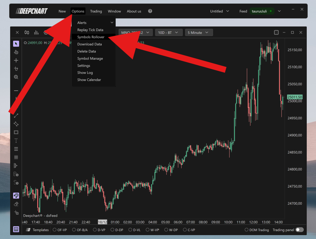 Na versão desktop (DeepChart), o rollover do contrato é feito manualmente.
